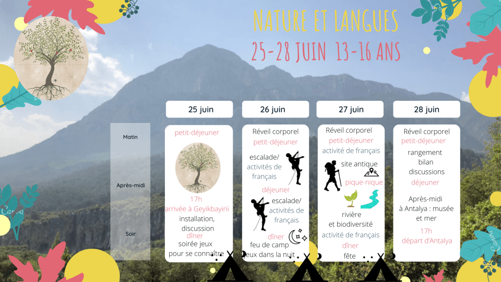 Le camp » après classe” est un camp court qui aura lieu à la sortie des classes. Nous accueillerons du 25 au 28 juin des enfants de 13 à 16 ans apprenant le français. Une bonne occasion de découvrir Geyikbayiri et son parc naturel. Les adolescents seront logés en tente dans le camping » vita camp » dans le village en pension complète. Ile seront accueillis sur place à 17 heures. Les tentes sont fournis, ils amènent leur sac de couchage et leur matelas. Ils auront des activités sur la langue française ( pédagogie active ) pour rebrasser les connaissances de l’année et préparer le vocabulaire nécessaire aux activités. Les enfants feront de l’escalade avec un guide spécialisé et découvriront le site antique, la rivière ainsi que la biodiversité du lieu auttur d’une ballade commentée. Les veillées seront animées de jeux, feux de camp et festivités pour accueillir les vacances. Nous passerons la dernière après -midi à Antalya où vous pourrez récupérer les enfants après notre tour au bord de mer et la visite du musée sur l’antiquité. 7 participants minimum 20 maximum.