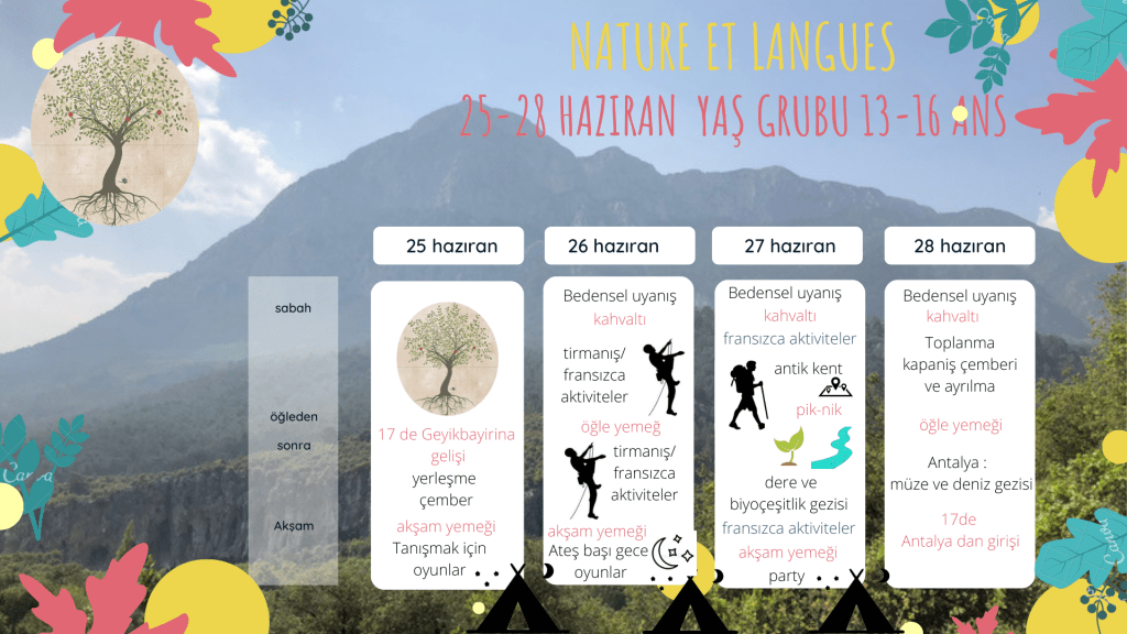 Okul sonrası kampı, okuldan sonra gerçekleşecek kısa bir kamptır. 25-28 Haziran tarihleri arasında Fransızca öğrenen 13-16 yaş arası çocukları ağırlayacağız. Geyikbayırı ve doğal parkını keşfetmek için harika bir fırsat. Gençler köydeki « vita camp » kamp alanındaki çadırlarda tam pansiyon konaklayacaklardır. Saat 17:00’de tesiste karşılanacaklardır. Çadırlar sağlanacak, ancak kendi uyku tulumlarını ve yataklarını getirmeleri gerekecek. Yıl boyunca öğrendiklerini tazelemek ve aktiviteler için gerekli kelime dağarcığını hazırlamak için Fransızca dilinde (aktif öğretim) aktiviteler yapacaklar. Çocuklar uzman bir rehber eşliğinde tırmanacak ve rehberli bir yürüyüş sırasında antik alanı, nehri ve bölgenin biyolojik çeşitliliğini keşfedeceklerdir. Akşam eğlenceleri arasında oyunlar, kamp ateşleri ve tatili karşılama şenlikleri yer alacaktır. Son öğleden sonra Antalya’da geçirilecek, deniz turumuz ve antik müze ziyaretimizden sonra çocukları toplayabileceksiniz. 7 katılımcı minimum 20 maksimum.