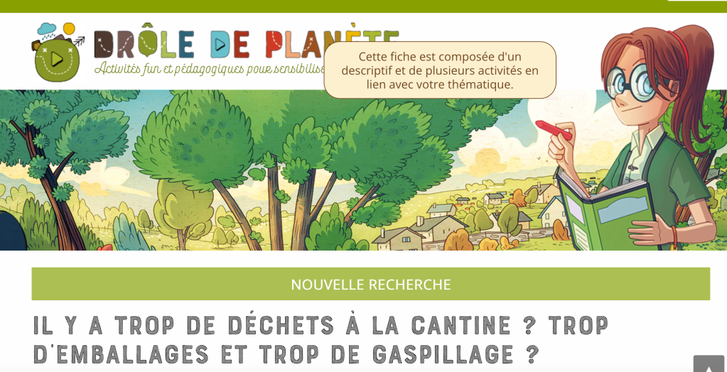 Un site belge super chouette avec des fiches pédagogiques, des web séries avec de nombreuses choses à apprendre et pour se mettre en mouvement! Notamment en ce qui concerne la thématique du FCME 6 une ficeh pédagogique pour réfléchir au gaspillageà la cantine et une réflexion sur l’impact écologique de la consommation de viande : https://www.droledeplanete.be/